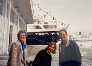 The ship was waiting for us, the four experienced Pan Am world travelers. Ha! They must have been thinking: those naïve American tourists, no raincoats, no umbrellas, making us wait, no sense of time, Tsk. Tsk.